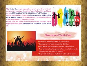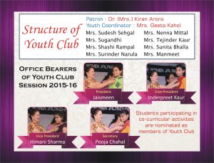 The Youth Club of the college provides a platform to the students to present and to groom their talents. It channelises the energy of the youth into creative directions and provides opportunities for harmonious and balanced development of their personality. It also plays a significant role in preserving and promoting rich cultural heritage of Punjab among the Youth.