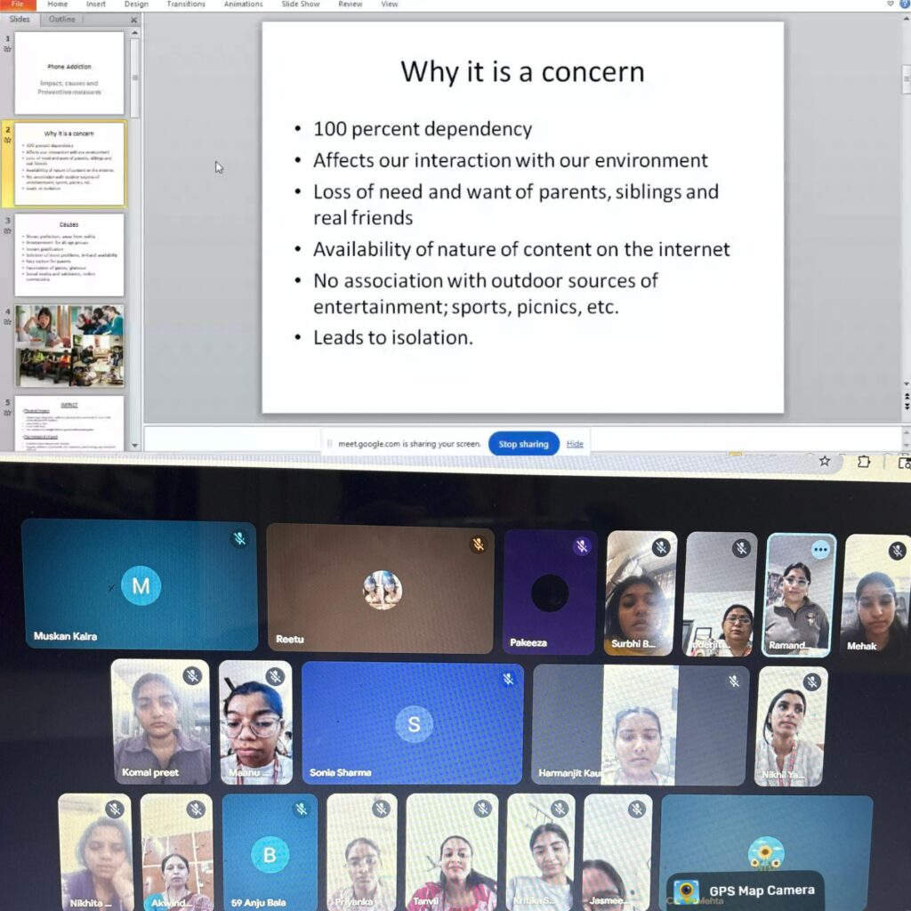 The resource person for the session was Ms. Ramandeep Kaur, Psychologist and Registered De-addiction and Rehabilitation Counsellor from New Zealand. She shared valuable insights into the difference between habitual phone use and addiction, along with its psychological implications. The session also highlighted the impact of excessive screen time on emotional well-being, productivity, and interpersonal relationships.